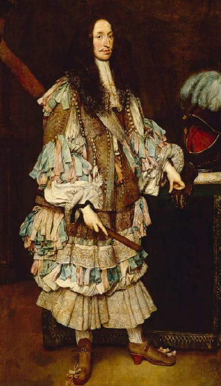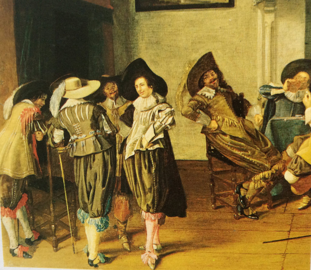 Les hauts de chausses gonflés deviennent une jupe culotte (rhingrave) qui se transformera ensuite en culotte, ancêtre du pantalon.