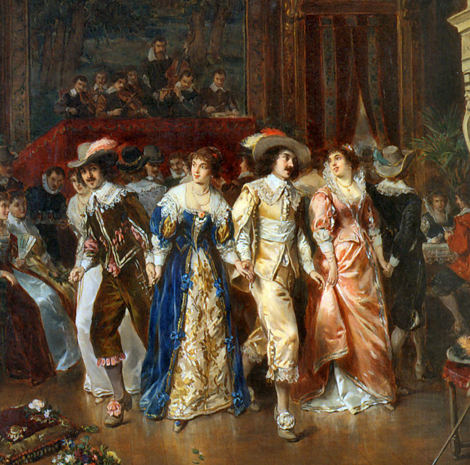 Les costumes se surchargent de rubans, pompons et autres falbalas aux teintes rose, bleu ou jaune présageant l’arrivée prochaine du rococo.