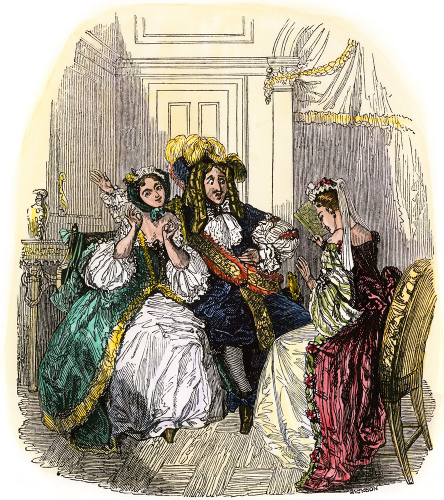 Louis XIV, protecteur des arts et des lettres, adepte du luxe, de l’opulence et des frivolités, affranchit l’habit en le débarrassant de ses accessoires rigides et oppressants qui emprisonnaient les corps et soutenaient les lourds tissus sombres de la période précédente, sous la Renaissance.