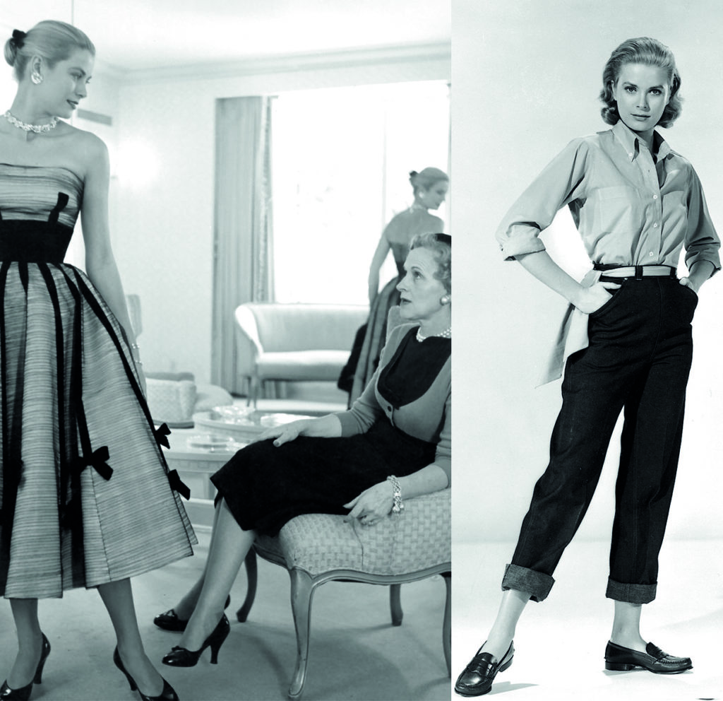 On ne veut plus ressembler à maman mais plutôt à Marilyn, Audrey ou Grace, icônes d’une époque en pleine mutation. Les jeunes hommes suivent le même mouvement avec James Dean, Brando ou Elvis en portant cuir, jean et t-shirts en coton simultanément avec la décontraction générale de la tenue masculine.